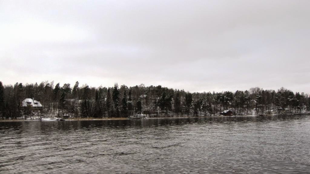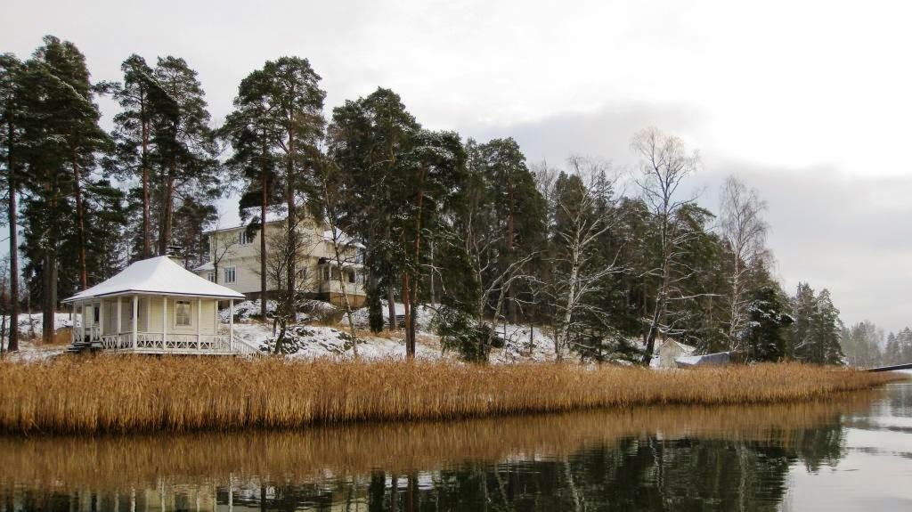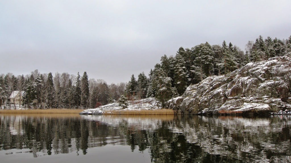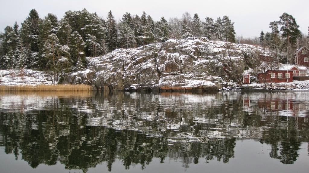 … ja lyhyeksi hetkeksi talviaurinko valaisee maiseman. Villa Draknäs heijastuu tyyneen Reposalmeen.