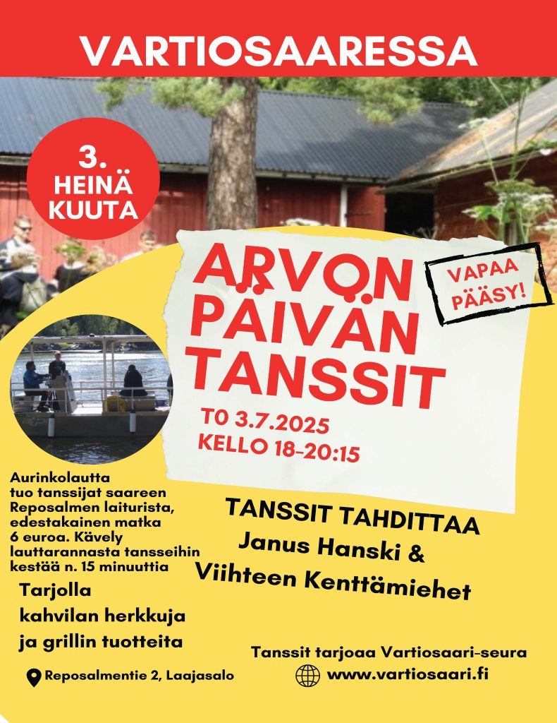 Vartiosaari-seura järjestää jo perinteeksi muodostuneet Arvon päivän tanssit 3.7.2025 klo 18-20:15 Vartiosaaren tallin ladossa.